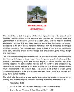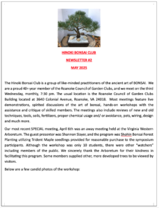 To view an issue of the Hinoki Bonsai Club Newsletter, simply CLICK on the issue for that month! HINOKI BONSAI CLUB NEWSLETTER #1 2025 NEWSLETTER #1 HINOKI BONSAI CLUB NEWSLETTER #2 MAY 2025 NEWSLETTER #2 MAY 2025
